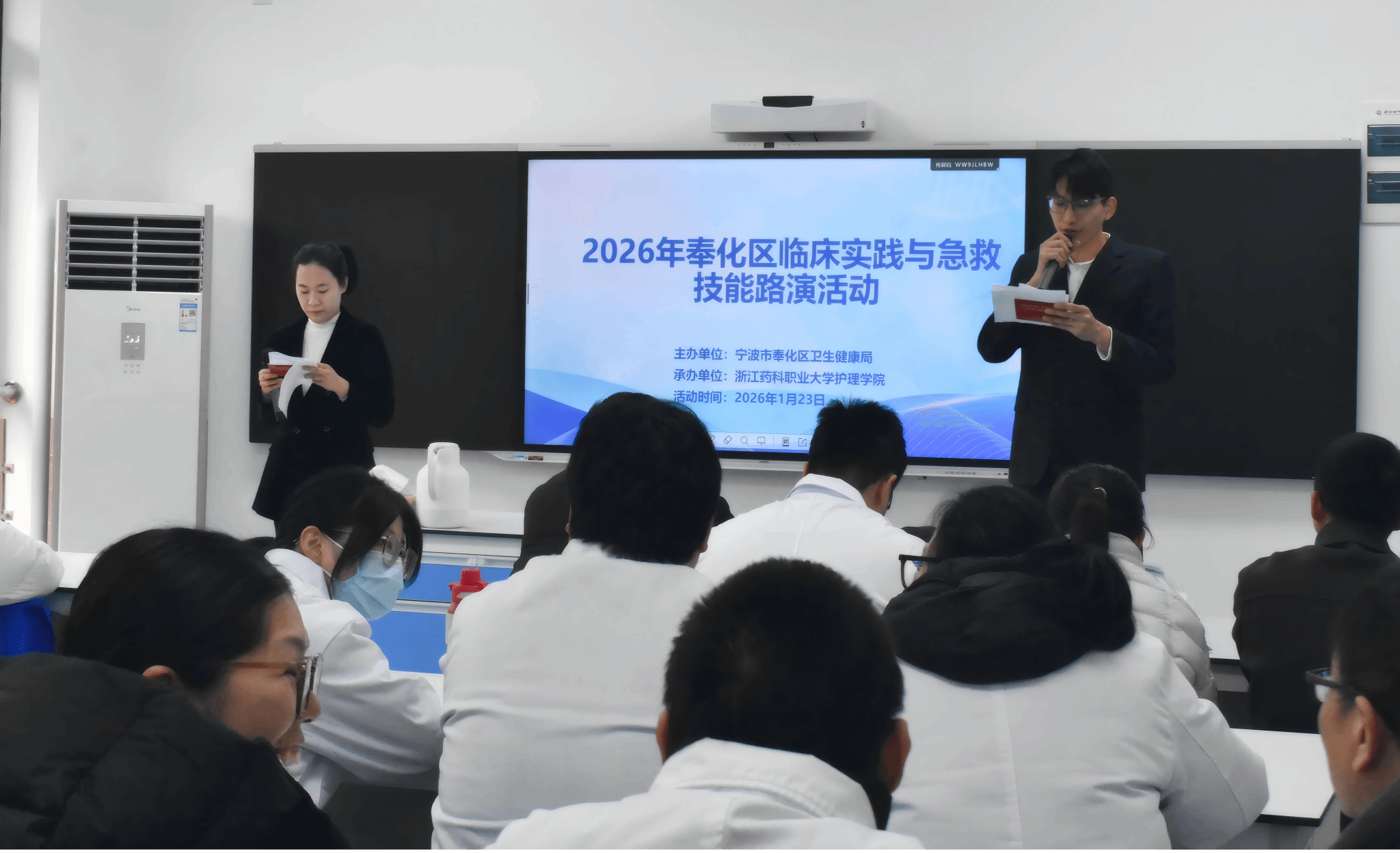 为进一步提升奉化区基层医疗机构临床实践能力与急救技能水平,深化区域医教协同发展,1月23日下午,“2026年奉化区基层临床实践与急救技能路演展示活动”在我校成功举办。本次活动由奉化区卫生健康局主办、我校护理学院协办,共有来自全区12家基层医疗机构的50余名医护人员同台竞技,以赛促练,展现专业风采。奉化区卫生健康局党委委员、副局长王盛强,学校产教融合与社会合作处、护理学院相关领导及师生代表共同参与。