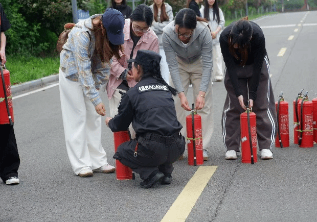 疏散环节结束后,全体人员在操场西侧集结,进入消防器材实操环节。校安全保卫部老师现场详细讲解并演示了灭火器的使用规范与技巧。师生们依次上前按照讲解实操演练,使用灭火器扑灭火源,掌握了各类消防器材的使用规范。